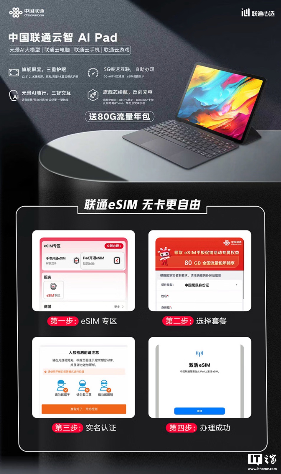IT之家 12 月 22 日消息多盈策略,中国联通现已推出一款云智 AI Pad 平板电脑,该机主打 5G eSIM,支持线上激活开通套餐,匹配展锐 T9100 芯片,京东经销商定价为 1799 元。