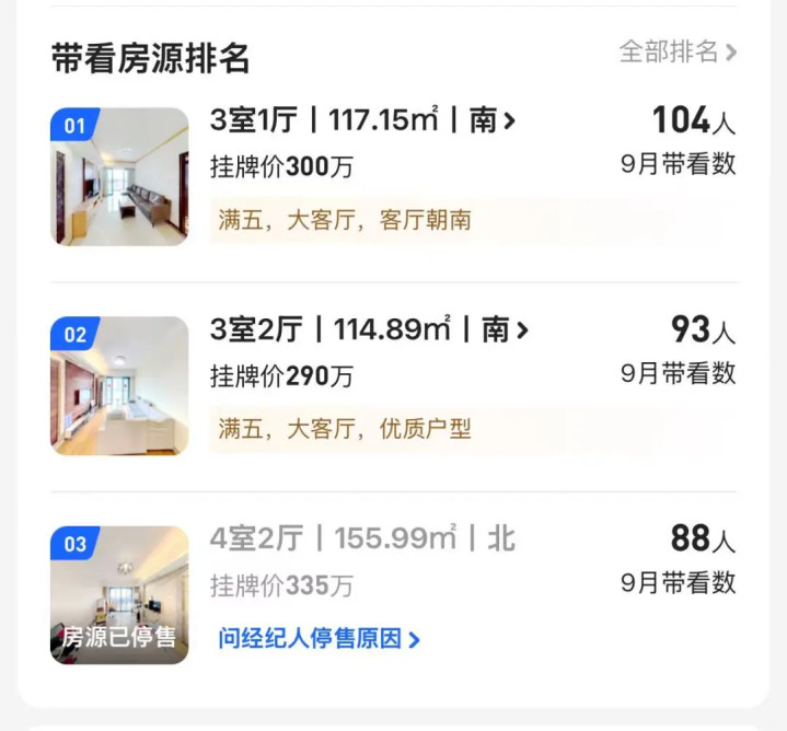 市场最热的房源,都是300万以下,9月带看最多的二手房,117的大3房,挂盘价300万,估摸着还有空间。