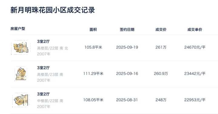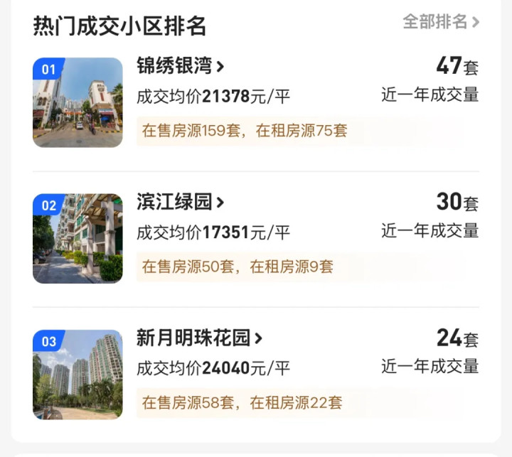 周围的小区怡景花园、敏兴四季花园、新月明珠花园也有将近10-20年的楼龄了,最近的新月明珠花园,二手挂盘价2.5万-2万8/方左右,成交价一直在下探,目前大概是2万2-2万4左右,250万左右,能买到一个100多方的3房。