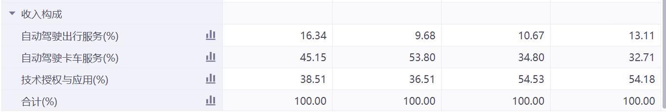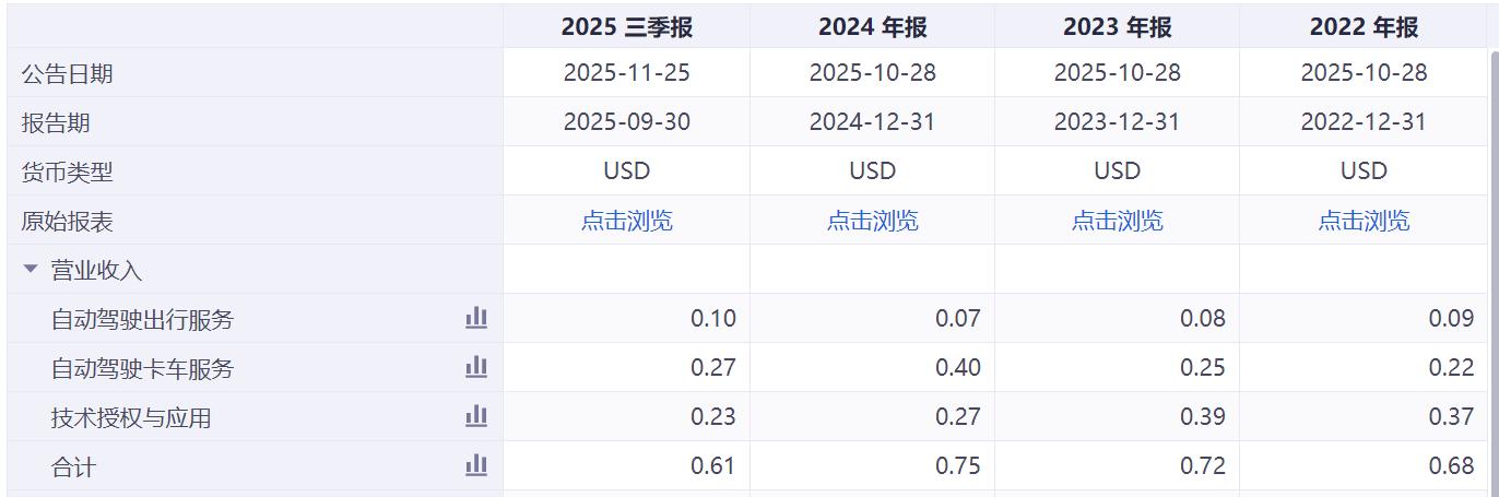 分业务来看,Robotruck(自动驾驶卡车)、技术授权依然是公司主要收入来源。2025年前三季度,两者营收占比分别达到43%、39%。相较之下,Robotaxi(自动驾驶出行)服务收入仅为0.1亿美元,占总收入比例不到10%。