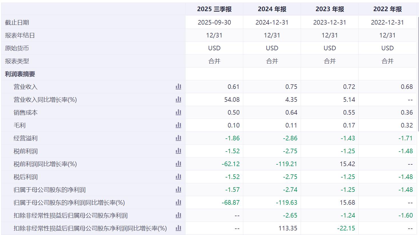 拆单季度看,2025Q3,公司实现收入为2544万美元,同比增长72.0%,环比增长18.6%,净利润为-6132万美元,2024Q3为-4189万美元,2025Q2为-5310万美元。